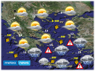 Οι άνεμοι θα πνέουν από βόρειες-βορειοανατολικές διευθύνσεις και θα φτάσουν στο Ιόνιο τα 6 Beaufort,στο Βόρειο Αιγαίο τα 8 Beaufort, στο Κεντρικό Αιγαίο τα 8-9 Beaufort και στο νότιο Αιγαίο, το Κρητικό Πέλαγος και το Καρπάθιο τα 7 Beaufort.