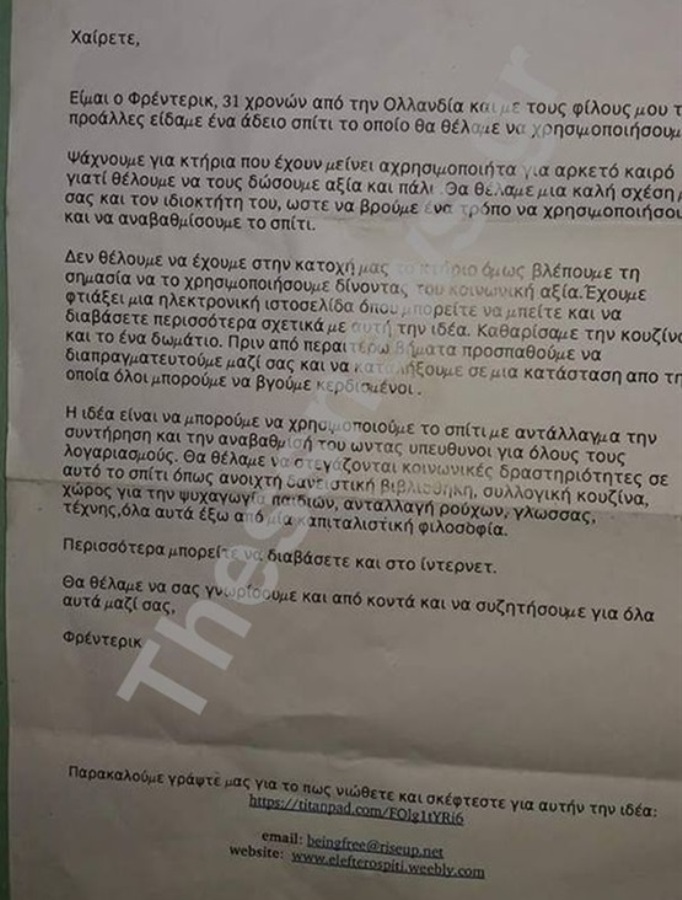 Μάλιστα είχε ετοιμάσει και επιστολή στα ελληνικά την οποία και θυροκόλλησε στο συγκεκριμένο σπίτι σαν να μην συμβαίνει τίποτα: